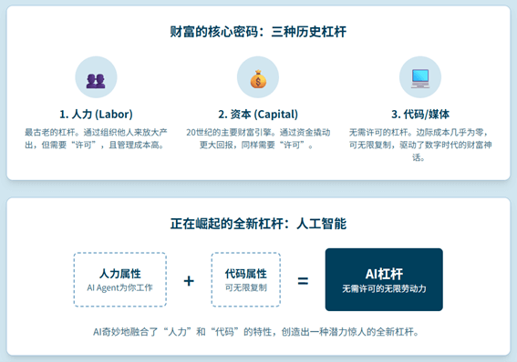 为什么说 AI 是一种全新的杠杆?因为它奇妙地融合了两种强大杠杆的特性: