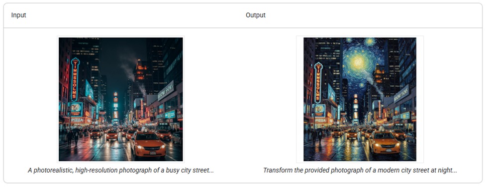 - 优化后的提示词: 将提供的现代城市夜景照片,转换为艺术家文森特·梵高的标志性艺术风格。保留原始构图,但使用充满表现力的粗犷笔触和旋转的星空来重新渲染整个画面。