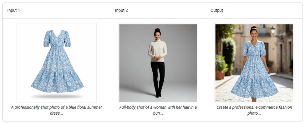 - 优化后的提示词: 请将两张提供的图片进行合成。提取第一张图片中的连衣裙,并将其无缝地穿在第二张图片中的模特身上,最终生成一张专业的电商时尚模特图。
