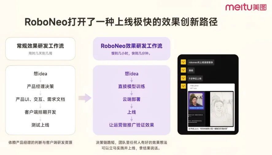 对此,美图的解法是“反惯性工作流”,并在新项目RoboNeo中进行了成功的实践(一个月封闭开发,上线首月百万MAU)。这个新模式有几个核心原则,我觉得非常值得借鉴: