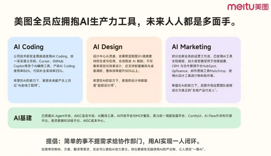 如果说Shopify的内部信是强制“学习AI”,美图这次明确提出了“人人都是多面手”,甚至“一个人就是一支团队”的目标。