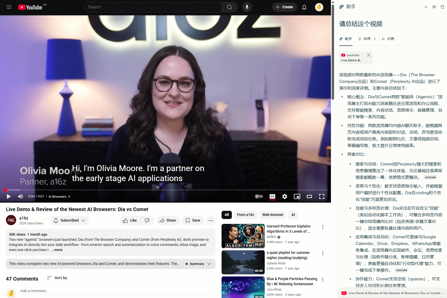 例如下面这个关于”Dia vs Comet”的AI浏览器对比视频,Comet会总结出核心功能对比、主要优势和劣势、适用场景以及用户评价。这让我能在几分钟内掌握一个小时视频的精华内容。