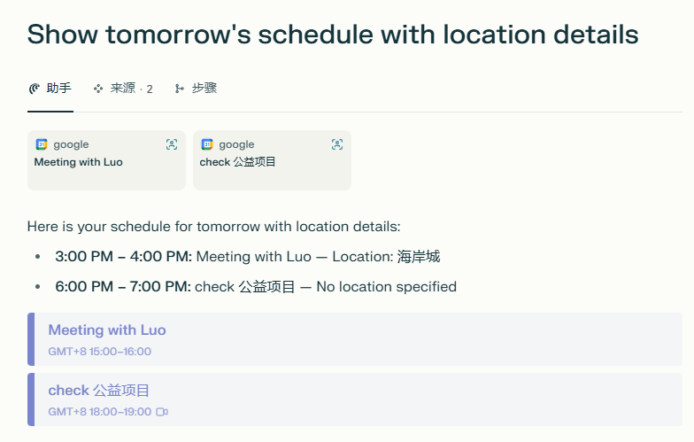 每天早上,我会问Comet:”Show tomorrow’s schedule with location details”(显示明天的日程及地点详情)。Comet会列出详细的安排,比如下午3点到4点在海岸城与Luo会面,晚上6点到7点检查公益项目的进度。
